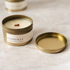 All natural, hand poured candle in a gold mini tin perfect for travel. Sustainably and ethically sourced natural beeswax, coconut, palm, and soy wax blend with a non-toxic crackling wood wick. Handmade and poured in Knoxville, Tennessee.