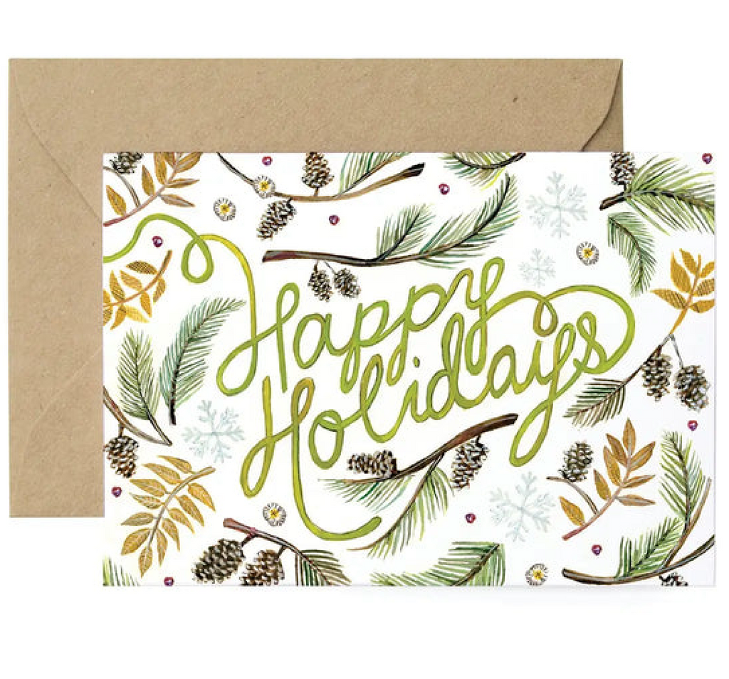 "Happy Holidays" with festive branches and greenery on the outside, blank inside. Hand illustrated by Lana's Shop based in Denver, Colorado.